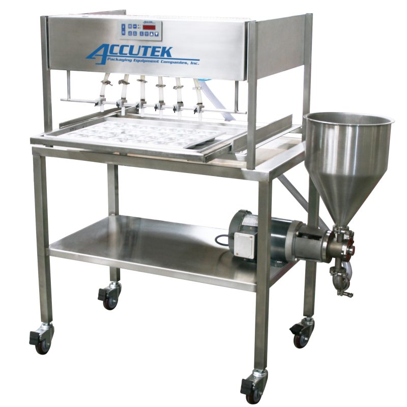 The Semi-Automatic Bakery Tray Depositor utilize Accuteks timed flow volumetric filling principle to automatically deposit creams, batters, or dough mixes. Minimal contact parts (hose, pump, and tank/hopper) make the SA Bakery Tray Depositor ideal for sanitary filling of food and specialty products. These machines feature six filling nozzles that can be individually adjusted and even turn on or off depending on the project needs. The speed and ease of use make these fillers the ideal machines for low to medium speed depositing operations.