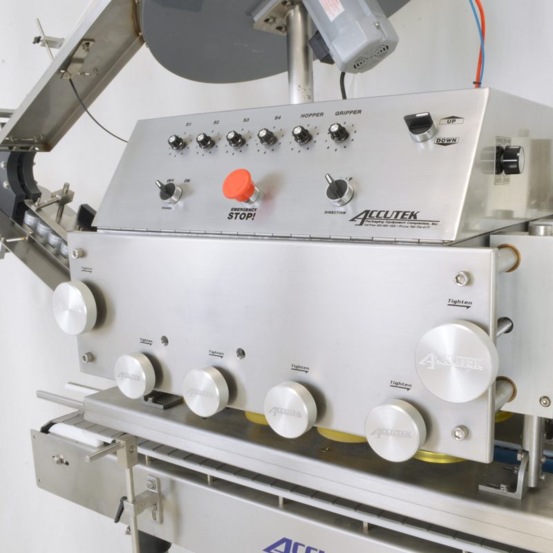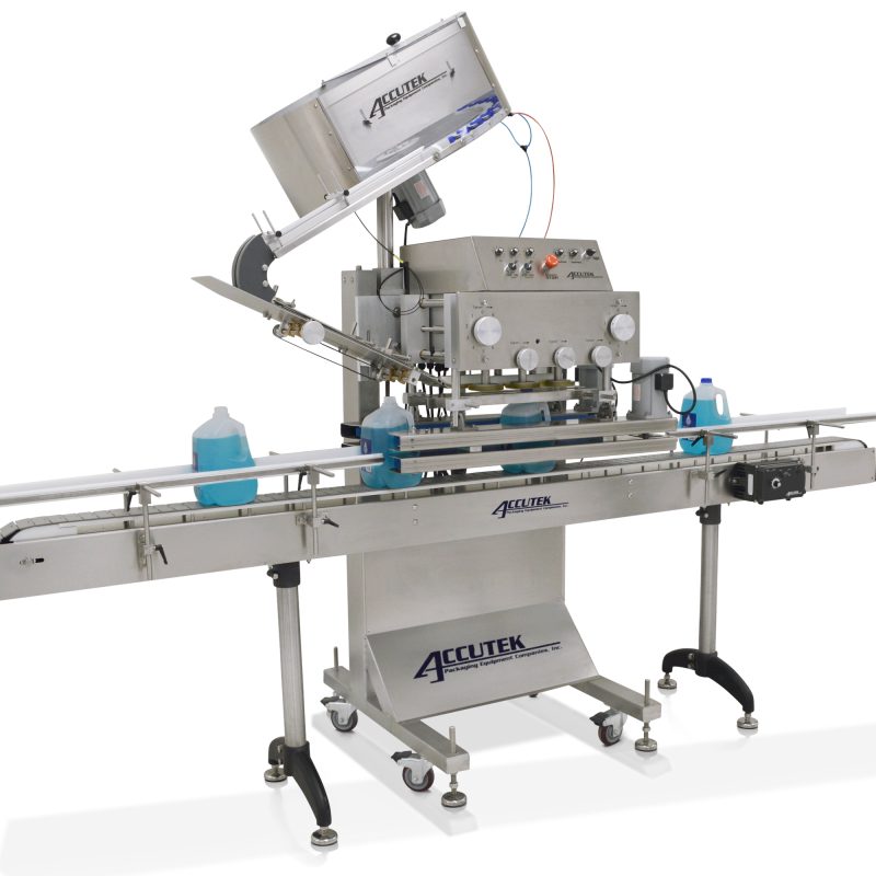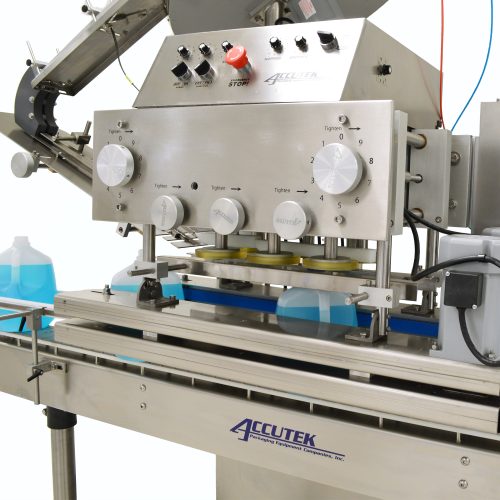 The Accutek Automatic Spindle Cappers machines are designed to automatically place and tighten a wide variety of screw and lug-type closures onto containers in a sanitary environment. Each tightening spindle is spring-loaded and driven by a torque-sensitive individual motor for increased disk-to-cap contact and reduced disk wear.