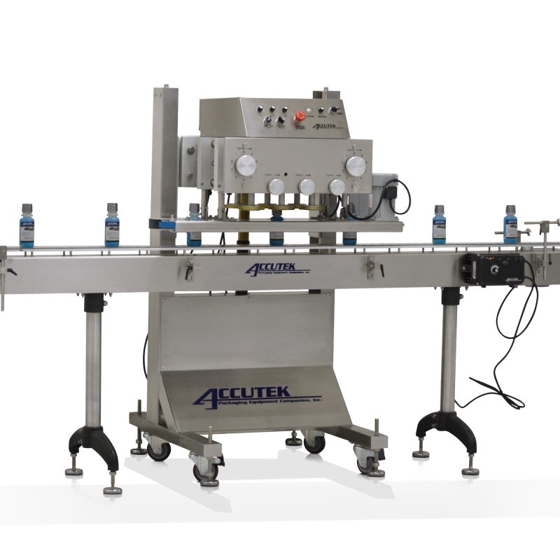 Accutek’s Semi-Automatic Spindle Capper (SSC-6) uses the latest technology to accurately torque most cap types onto a wide range of bottles. The Accutek SSC-6 can torque flat caps, flip top caps, pull spouts, safety caps, child proof caps, sport caps, trigger pumps, and closures with over-caps or induction seals at speeds up to 120 cpm*.