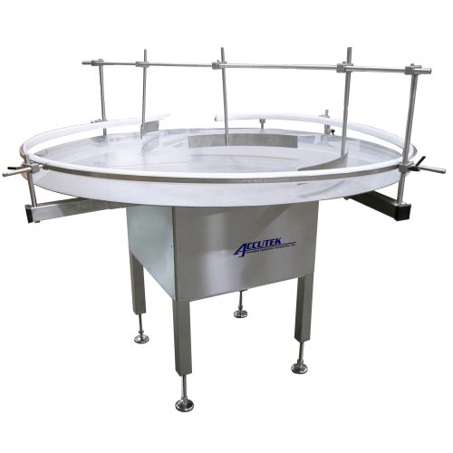 The AccuTurn 48 Unscrambling turntables are designed to load your containers onto the filling machine line. These machines can be added to your existing line or purchased with a complete filling system. The tops are available in polished stainless steel. They are cut to create a perfect circle. They are adjustable up to four inches. Our turntables are constructed from the highest-quality stainless materials with variable speed drives, reversible rotation, and are height-adjustable. Contact Accutek today to learn more about this machine. Recommended Products- Any products that can fit on an Accutek conveyor