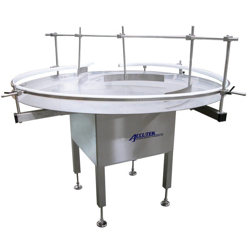 The AccuTurn 60 Unscrambling turntables are designed to load your containers onto the filling machine line. These machines can be added to your existing line or purchased with a complete filling system. The tops are available in polished stainless steel or polyethylene. They are cut to create a perfect circle. They are adjustable up to 4 inches. Accutek’s Unscrambling turntables are powered tables that unscramble and load bottles onto the conveyor. These tables are constructed from the highest quality stainless materials with variable speed drives, reversible rotation, and are height-adjustable.Features