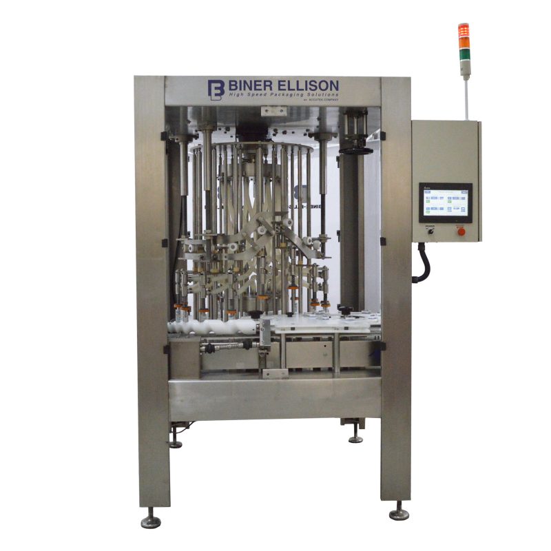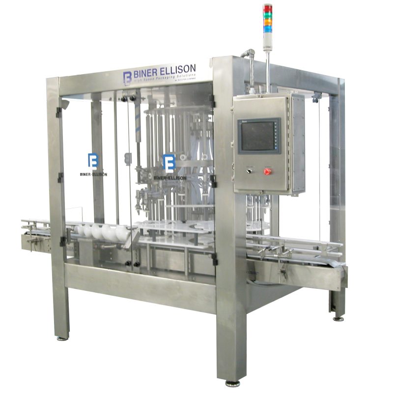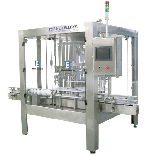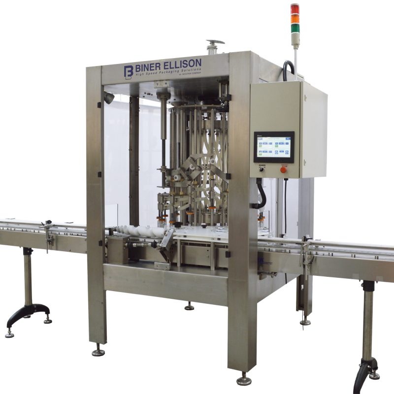 This Biner Ellison Rotary Overflow Filler is a fast and accurate filling system, the perfect choice for all free-flowing, non-carbonated liquid products, such as foods, beverages, cosmetics, and chemicals. The ROF-52 uses “Fill-to-Level” technology, guaranteeing perfect bottle fill levels. This machine includes advanced features, safety systems, and new production technology that boosts its productivity past any machine in its class.