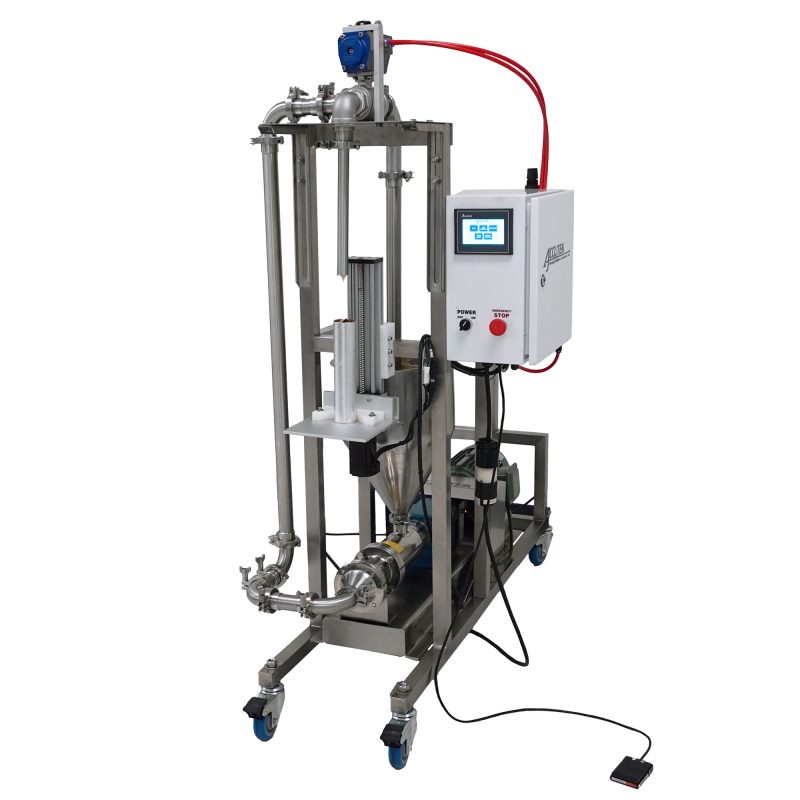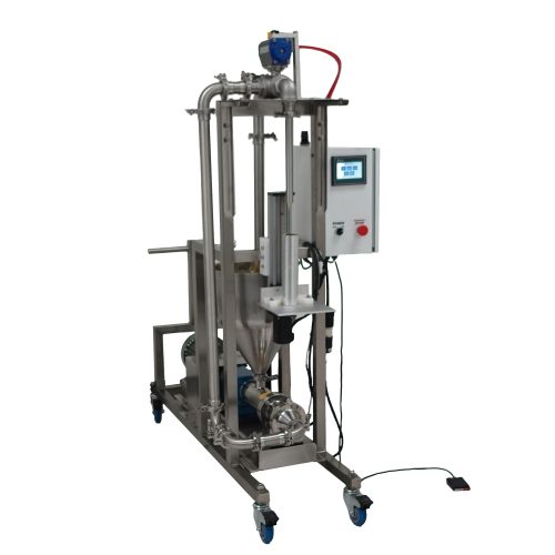 The Screw Pump is a positive displacement pump that excels at handling thick, dense products. This machine runs continuously and features a valve that directs the product to the filler nozzle or back into the supply hopper. A unique servo-controlled container lift platform keeps the fill nozzle submerged just below the surface of the rising product to prevent air pockets in the fill.