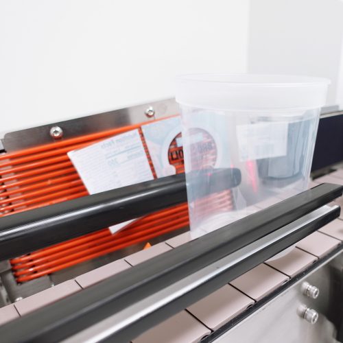 Accutek’s 106 TA is a pressure-sensitive labeler designed to wrap tapered containers and is ideal for wrapping round containers. Filled and capped bottles enter the labeler on the conveyor belt and slow down when they reach the bottle spacer wheel. The bottle spacer wheel speed sets the space between bottles as they travel toward the peel plate.