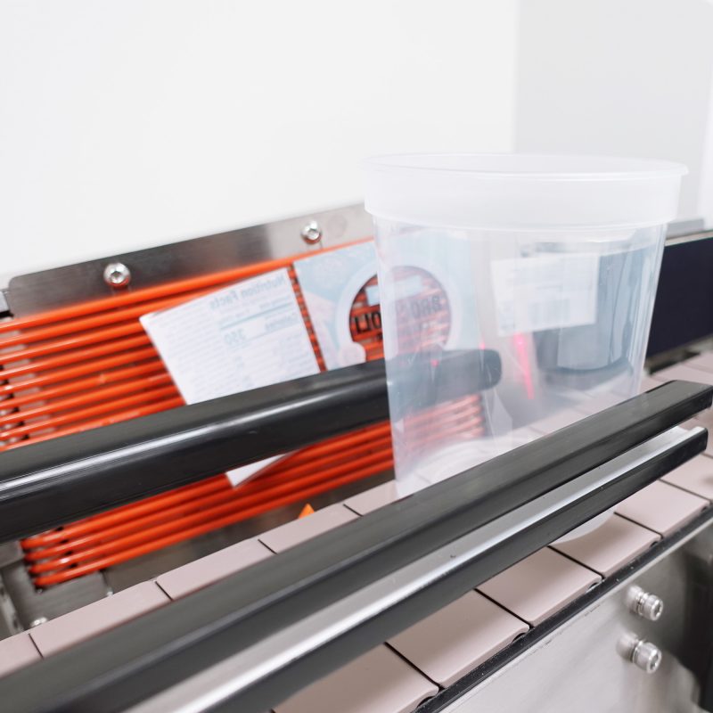 When the bottle sensor sees a bottle, it signals the drive roller to pull a label across the peel plate. The flagged label’s sticky leading edge attaches to the bottle as it passes the peel plate. The wrap belt rolls the bottle against the pressure plate and presses the label around the bottle. The conveyor then moves the labeled bottle past the label head. The label itself is indexed to a vacuum station that holds the label at the angle that correlates to the angle of the container’s taper.
