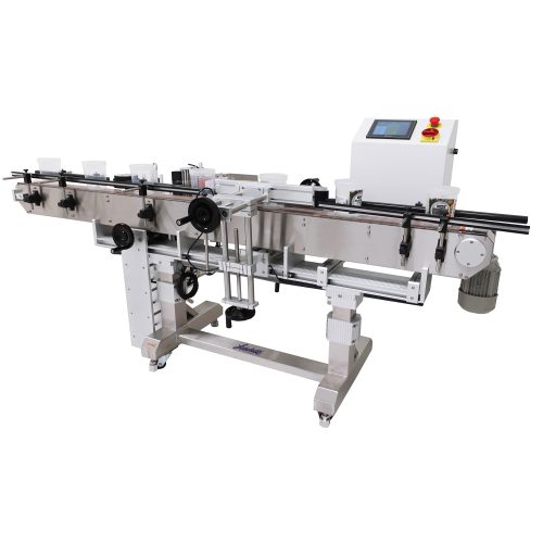 Accutek’s 106 TA is a pressure-sensitive labeler designed to wrap tapered containers and is ideal for wrapping round containers. Filled and capped bottles enter the labeler on the conveyor belt and slow down when they reach the bottle spacer wheel. The bottle spacer wheel speed sets the space between bottles as they travel toward the peel plate. When the bottle sensor sees a bottle, it signals the drive roller to pull a label across the peel plate. The flagged label’s sticky leading edge attaches to the bottle as it passes the peel plate. The wrap belt rolls the bottle against the pressure plate and presses the label around the bottle. The conveyor then moves the labeled bottle past the label head. The label itself is indexed to a vacuum station that holds the label at the angle that correlates to the angle of the container’s taper. Contact Accutek today to learn more about this machine. Recommended Products- Round containers