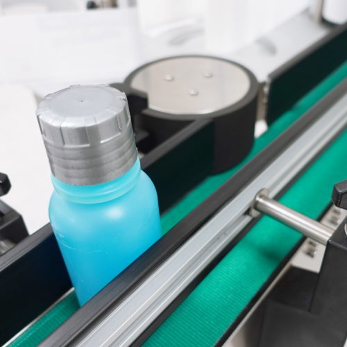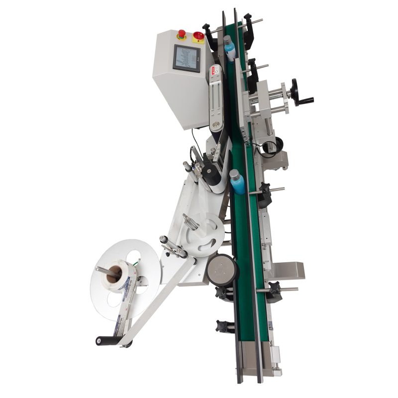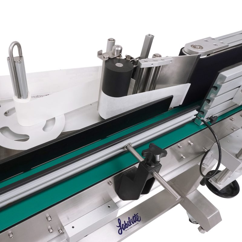 The labeler is designed with a fabric belt to assist in labeling containers incompatible with the flexible chain link on the standard APS or PSA series labelers. The fabric belt will not mar or scratch high-gloss cosmetic bottles during labeling.