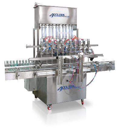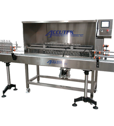 The product characteristics, anything from water to peanut butter, determine the technology best suited for our customers. Accutek’s timed flow volumetric filling machines are best suited for filling liquids with low to medium viscosity. These fillers are highly accurate, very sanitary, and have options for filling molten products. They can be used to fill light foamy products as well.