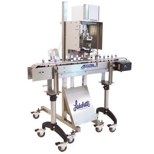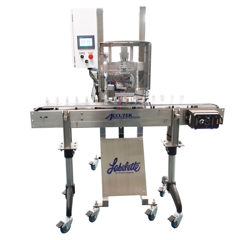 The AccuSleever places heat-shrinkable tamper-evident bands on containers. Containers move through the machine on a conveyor at rates up to 65 containers per minute. With an adjustable C-frame, the touchscreen-controlled machine is fast and affordable.